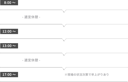 屋外での仕事が多いので、夏の暑さや冬の寒さはやっぱり慣れるまで大変でしたね。でも残業はほとんどないし作業が終われば早上がりもできるので、仕事終わりはしっかり休めてますよ!