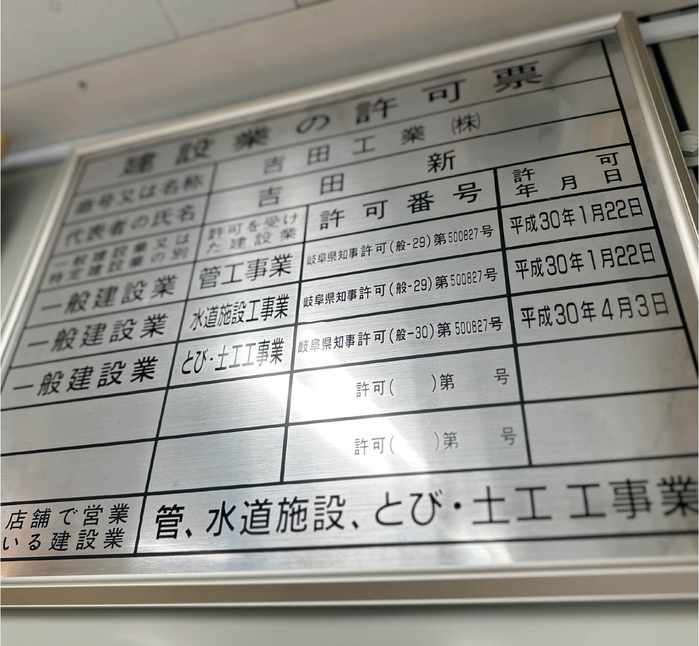 | 許可 | 管工事業、水道施設工事業 とび・土工工事業 |